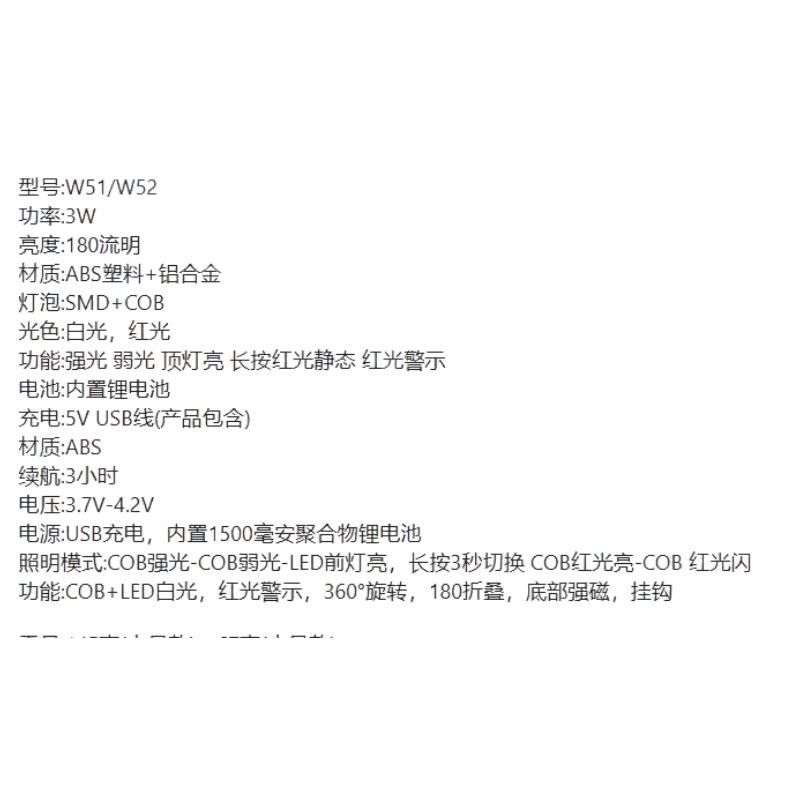 W51 W52 ไฟ LED ทำงานแบบ COB 3W 180Lm แบบชาร์จไฟได้แบบพกพาพร้อมฐานแม่เหล็กสำหรับการตั้งแคมป์เดินป่าใช้ในกรณีฉุกเฉิน