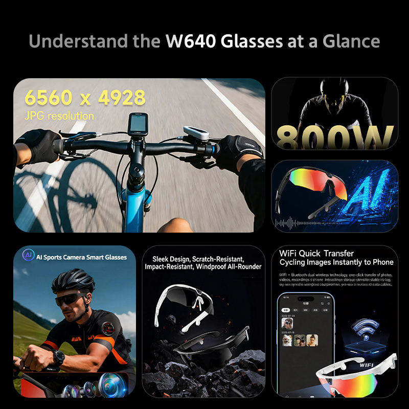 แว่นตาอัจฉริยะสำหรับปั่นจักรยาน W640 แว่นตากันแดดกีฬาโลหะสำหรับขับขี่จักรยานวิ่งกลางแจ้ง ป้องกันรังสียูวี 400 กันลม พร้อมกล้องบันทึกวิดีโอ 1080P บันทึกเสียง/แอปพลิเคชัน