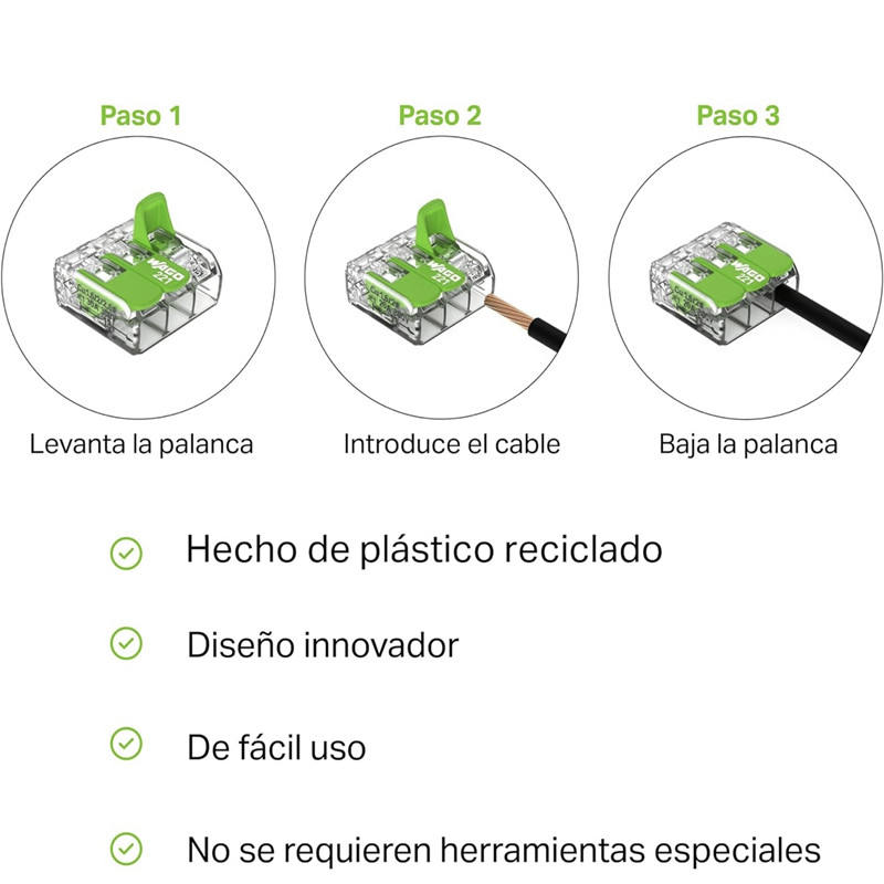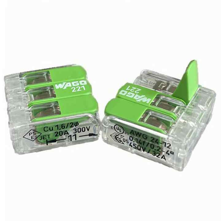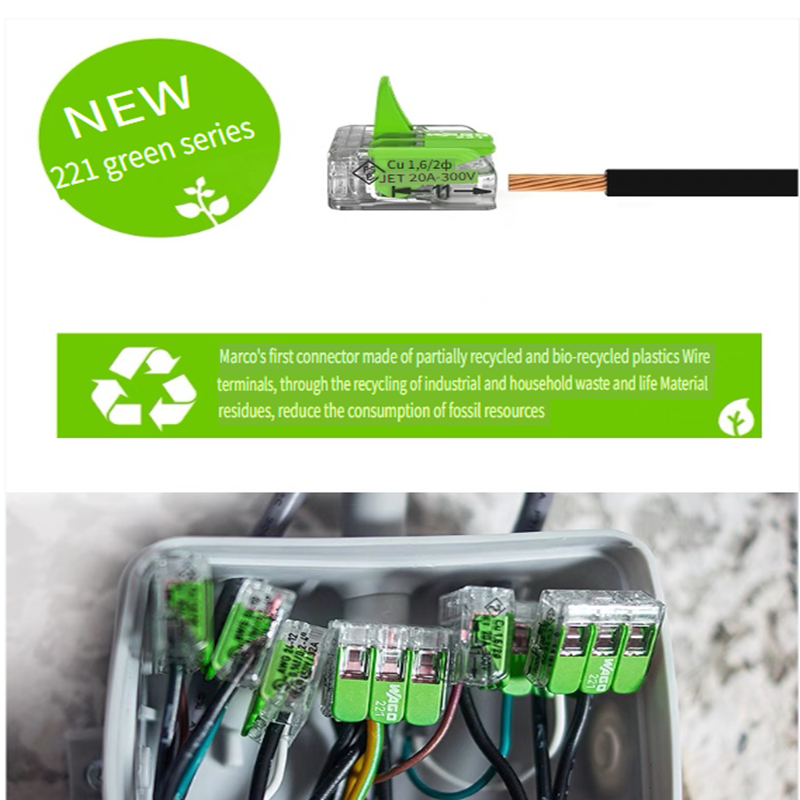 Wagos เทอร์มินัลบล็อก3รูชุดสีเขียว221-422/423/425ขั้วต่อสายไฟ24-12AWG เป็นมิตรกับสิ่งแวดล้อม