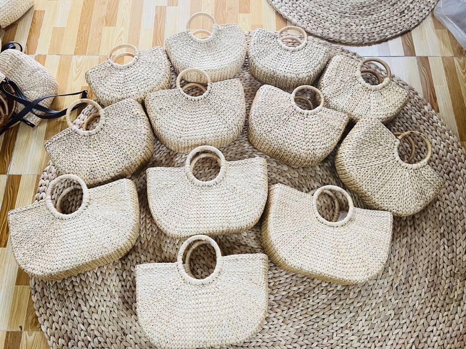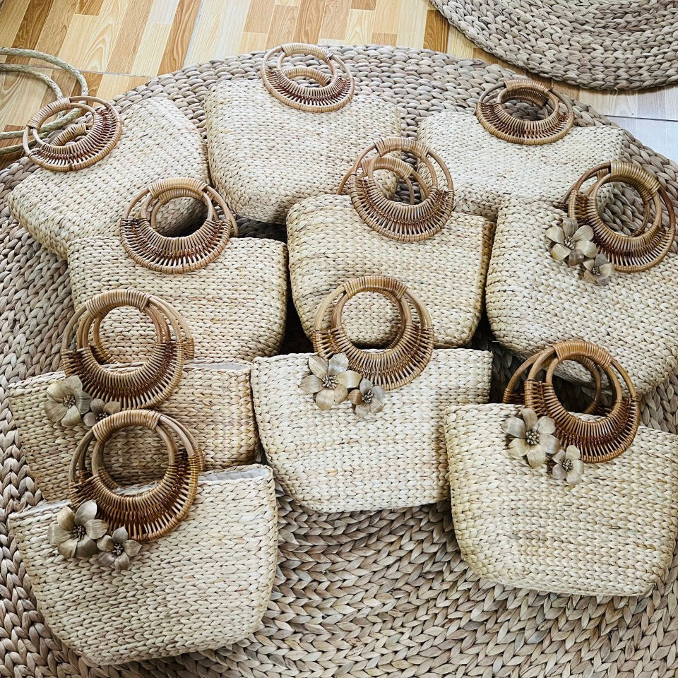 Natural Style Water Hyacinth Picnic Bag From Vietnam Handled Embroidered Bows Tassels Flowers Bamboo Fiber Lining Open Closure