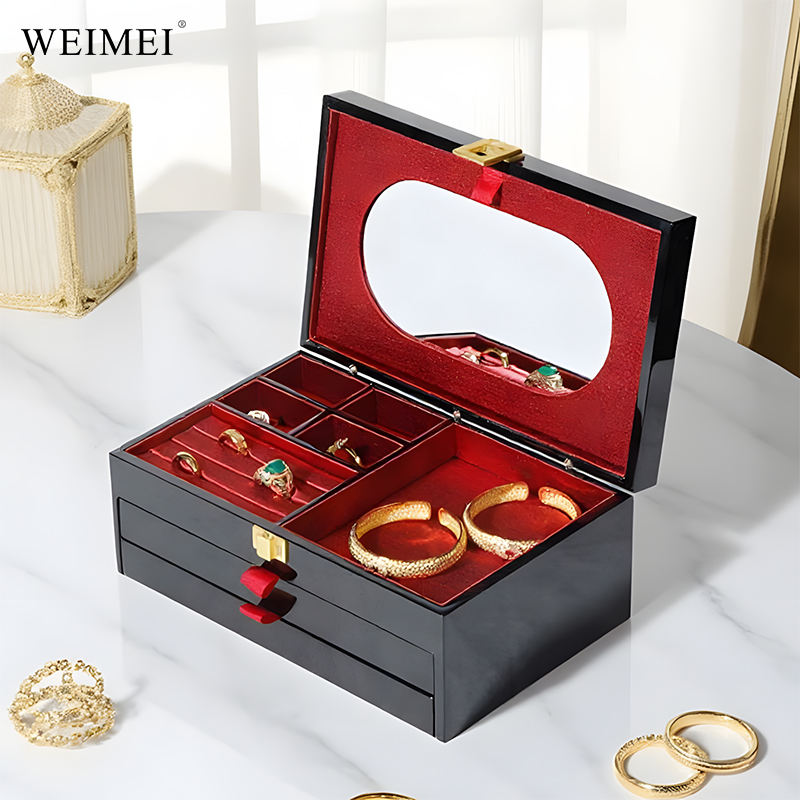 Weimei กล่องเก็บเครื่องประดับสีดำสีแดง, กล่องไม้แลคเกอร์กระจก3ชั้นดีไซน์วินเทจโลโก้ที่กำหนดเองสำหรับการแสดงแหวนสร้อยคอระดับพรีเมียม
