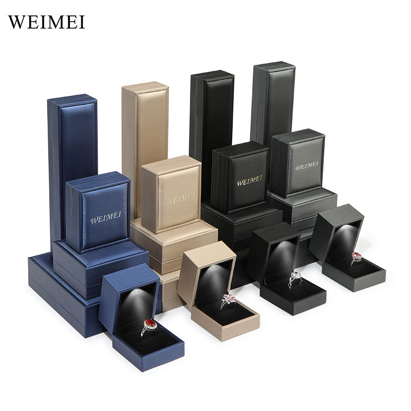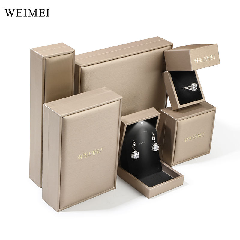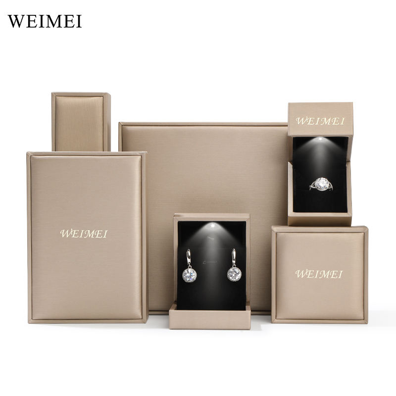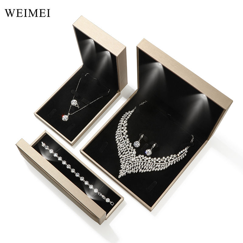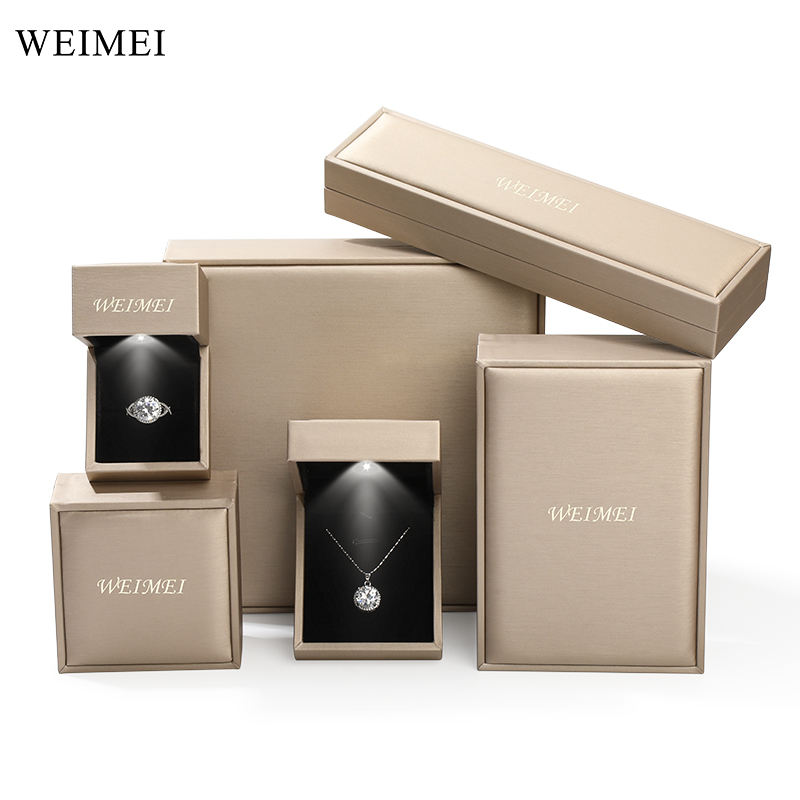 กล่องใส่เครื่องประดับ WEIMEI แบบกำหนดเองพร้อมโลโก้สีทอง กล่องใส่สร้อยคอ แหวน กำไลข้อมือ ชุดกล่องเครื่องประดับพร้อมไฟ
