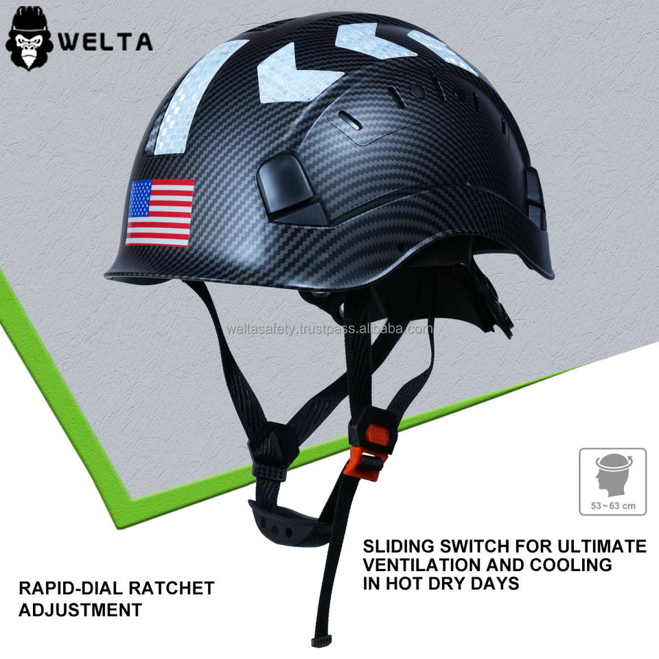 WELTA ANSI Z89.1 CE EN397 หมวกนิรภัยแบบวงกลม ลายคาร์บอนไฟเบอร์ ผลิตจาก ABS สำหรับอุตสาหกรรม ป้องกันส่วนบุคคล แบบมีร่อง 6 จุดแขวน น้ำหนัก 420 กรัม