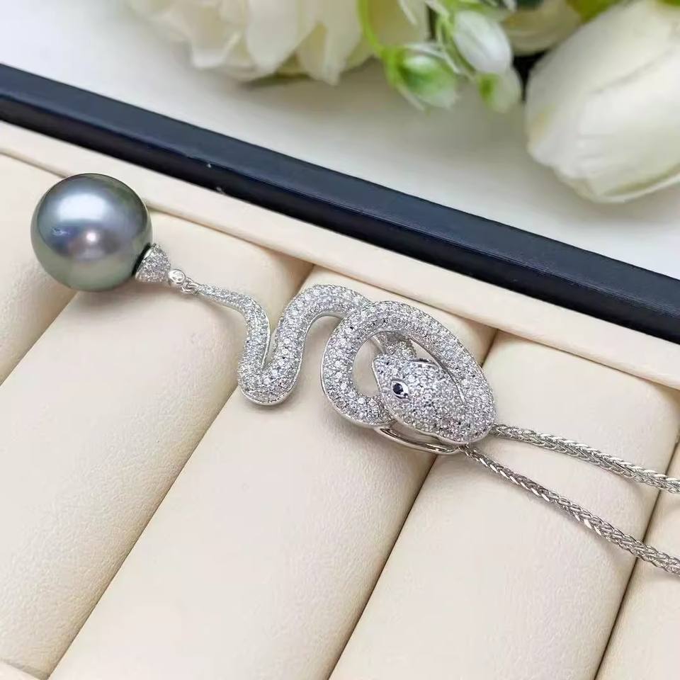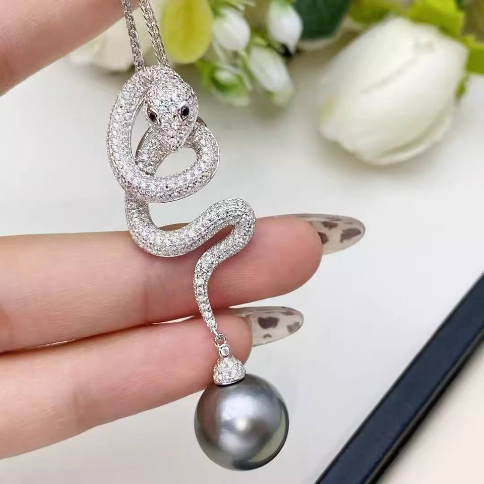 จี้เงิน WENCHI 10116 DIY พร้อมถาดเปล่าสำหรับไข่มุกทรงกลม 10-15 มม. ลายงู 3 มิติ S925 พร้อมอุปกรณ์เสริมสำหรับสร้อยไข่มุก จีน