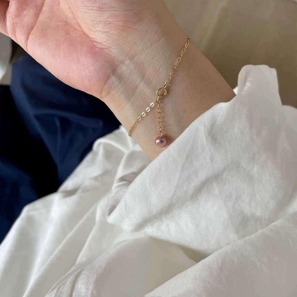 กำไลข้อมือทองคำ 14K แบรนด์ WENCHI ประดับมุกน้ำจืดสีม่วงทรงบาโรก ดีไซน์หรูหราเคลือบทองแดง ประดับมุกเกรด AAA ระยิบระยับดุจป่าไม้