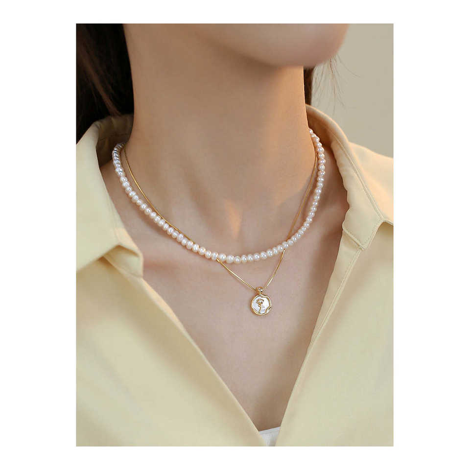 สร้อยคอมุกน้ำจืดธรรมชาติแบบซ้อนสองชั้น WENCHI พร้อมจี้รูปดอกกุหลาบ ดีไซน์เฉพาะสำหรับผู้หญิง โซ่หรูหรา 450 กรัม