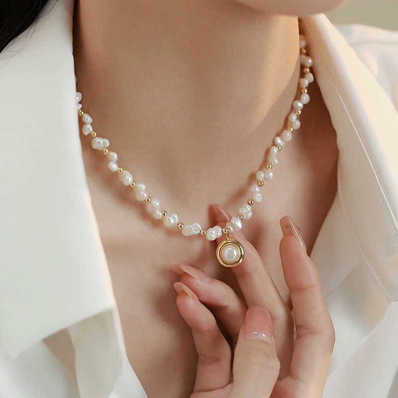 สร้อยคอผู้หญิงสไตล์วินเทจฝรั่งเศส แบรนด์ WENCHI ประดับมุกน้ำจืดทรงบาร็อคธรรมชาติ เพชร และลูกปัดหลากหลายแบบ ชุบโรเดียม สไตล์คริสเตียน