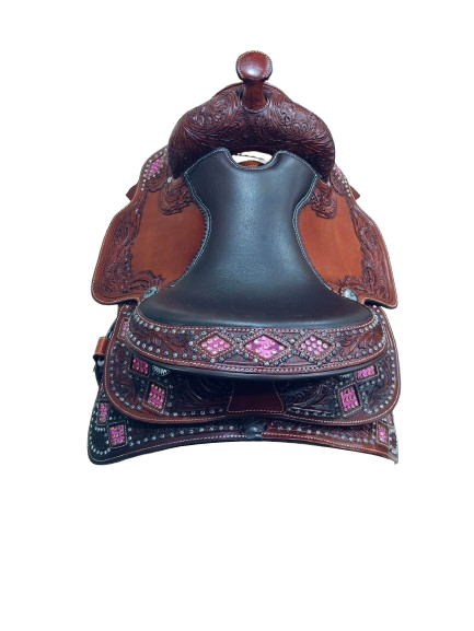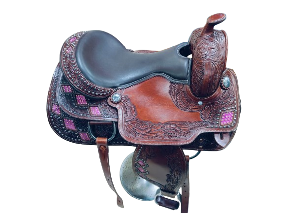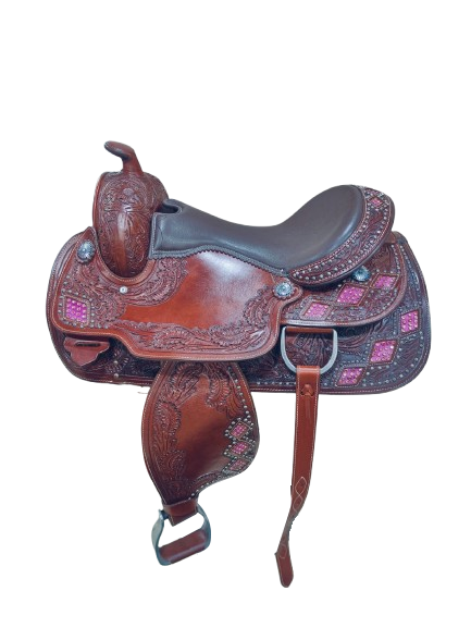 อานม้าแบบตะวันตก ยี่ห้อ WESTERN RENINIG COMFORTABLERIDING ผลิตจากหนังควายนุ่มและโครงไม้ มีขนาดให้เลือกตั้งแต่ 15 นิ้ว ถึง 17 นิ้ว
