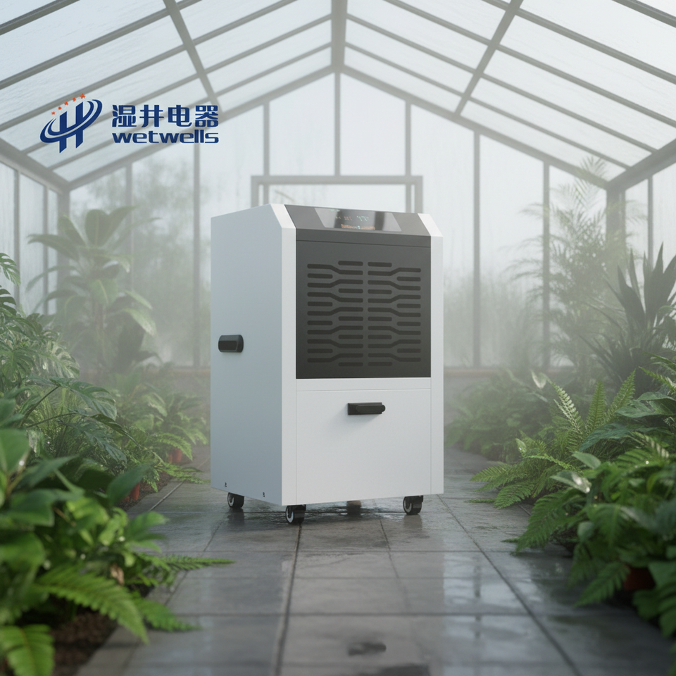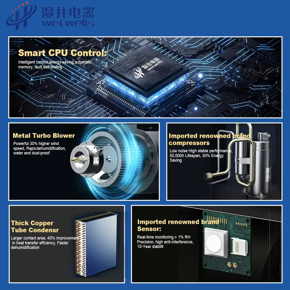 เครื่องลดความชื้นอุตสาหกรรมสแตนเลส WETWELLS 56 ลิตร/วัน 800 วัตต์ 30 กก. พร้อมระบบระบายน้ำต่อเนื่อง สำหรับโรงงาน OEM 220V รุ่นใหม่