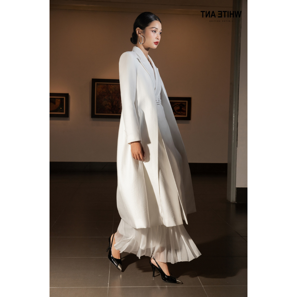 เสื้อโค้ทผู้หญิงคอปกแบบเปิดลงสีขาวพร้อมเข็มขัดสีขาว OSWIN เสื้อโค้ทแหลม79% ไนลอน17% ใยสังเคราะห์4% โพลีฉลากส่วนตัว