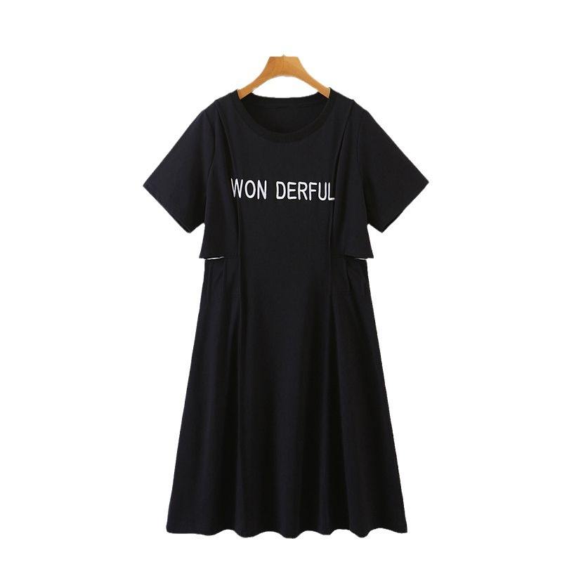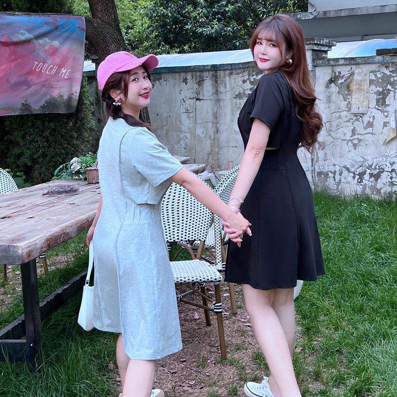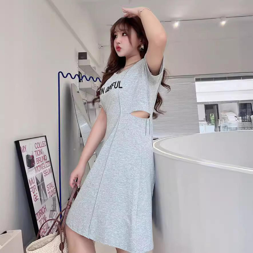 WONDERFUL ชุดเดรสแขนสั้นคอโอสำหรับผู้หญิงไซส์ใหญ่ผ้าฝ้ายสีเทาเอวธรรมชาติ N8395