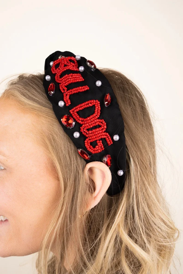 WOOF Headband / Game Day Beaded Rhinestone Pearl Gameday Apparel / Red Black / Gifts for Her SIC EM Bulldog Dawgs