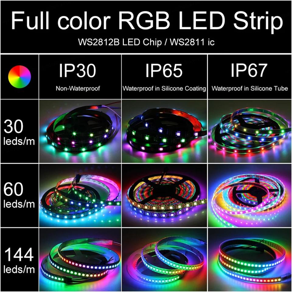ไฟ LED แบบเส้น WS2812B 5050 RGB 5V 30/60/144LED พิกเซล ชิป Ws2812 ควบคุมสีได้ ไฟ LED RGB แบบเส้น กันน้ำ IP30 IP65 IP67