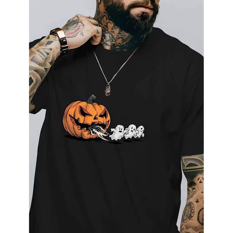 เสื้อยืดฮาโลวีนผู้ชาย WU JIANZHAN ลายหน้าฟักทองสุดหลอนและผี พิมพ์ลายแขนสั้น สีดำและสีส้ม ทรงคอกลม รุ่น 406