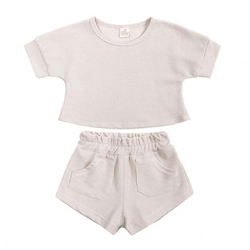 ชุดเสื้อผ้าเด็กฤดูร้อนลายวาฟเฟิล ชุดสองชิ้นสำหรับเด็ก ชุดเด็กผู้ชาย ชุดเซ็ตเสื้อผ้าเด็กแบบเรียบๆ ของ Custom Kids Tales