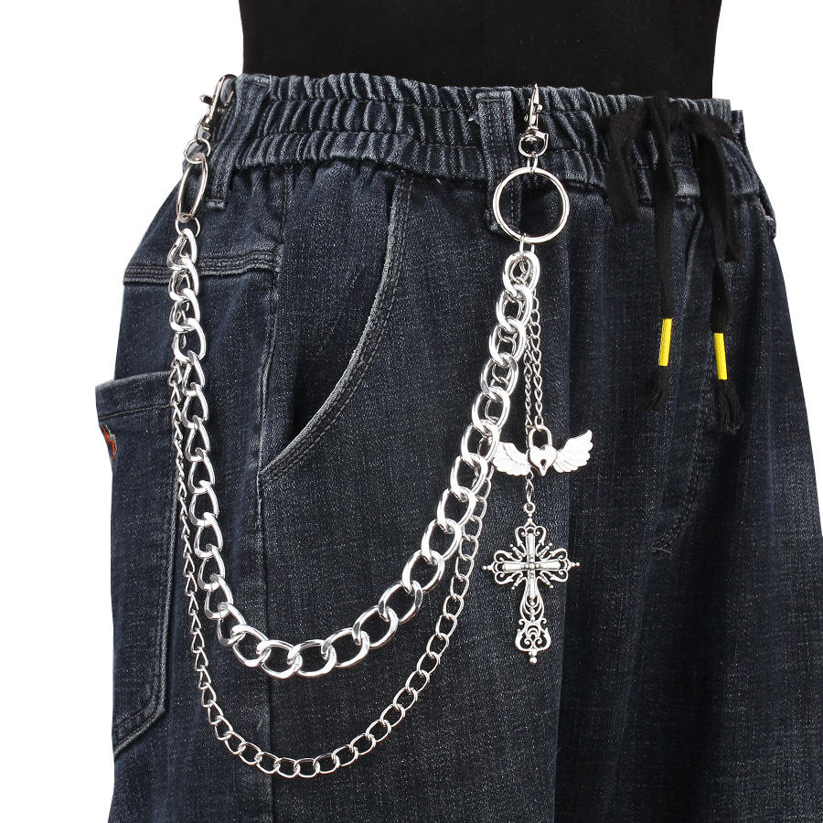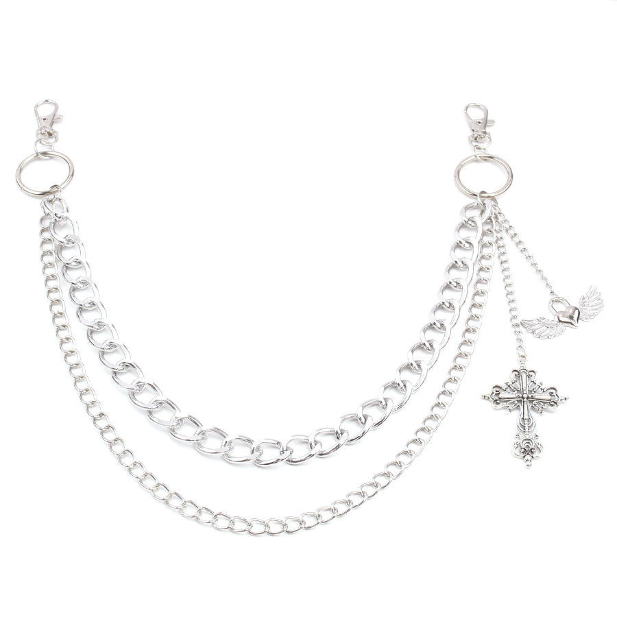 โซ่คาดเอวสองชั้น โซ่โลหะพร้อมจี้รูปกางเขนและปีก สำหรับใส่กับกางเกงในชีวิตประจำวัน โซ่คาดตัวทำจากโลหะผสมสังกะสี