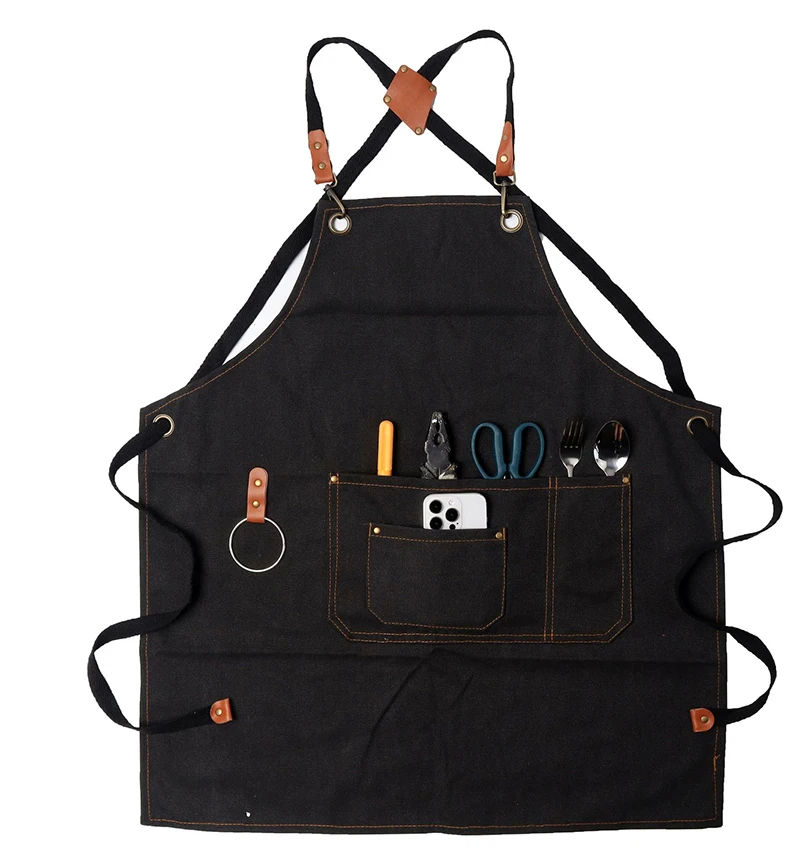 ผ้ากันเปื้อนผ้าใบแบบปรับได้มีกระเป๋าหลายช่องผ้ากันเปื้อนผ้าฝ้ายโพลีคุณภาพสูงสีดำสำหรับร้านอาหารบริกรพ่อครัว
