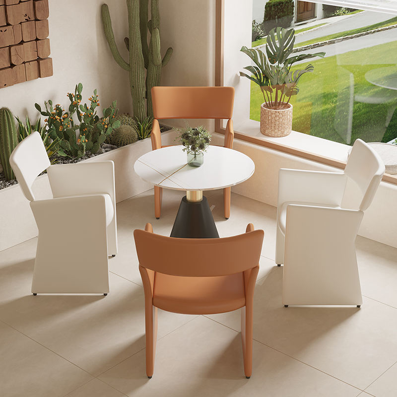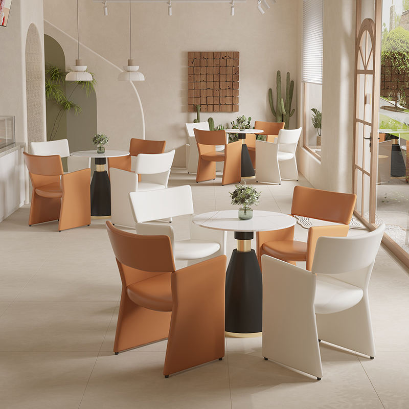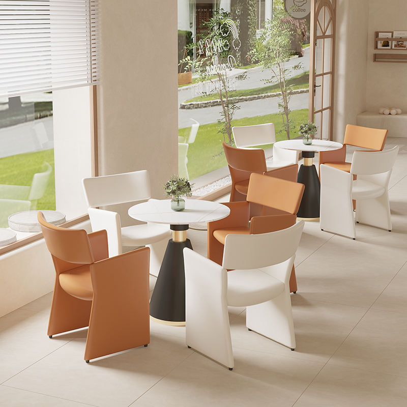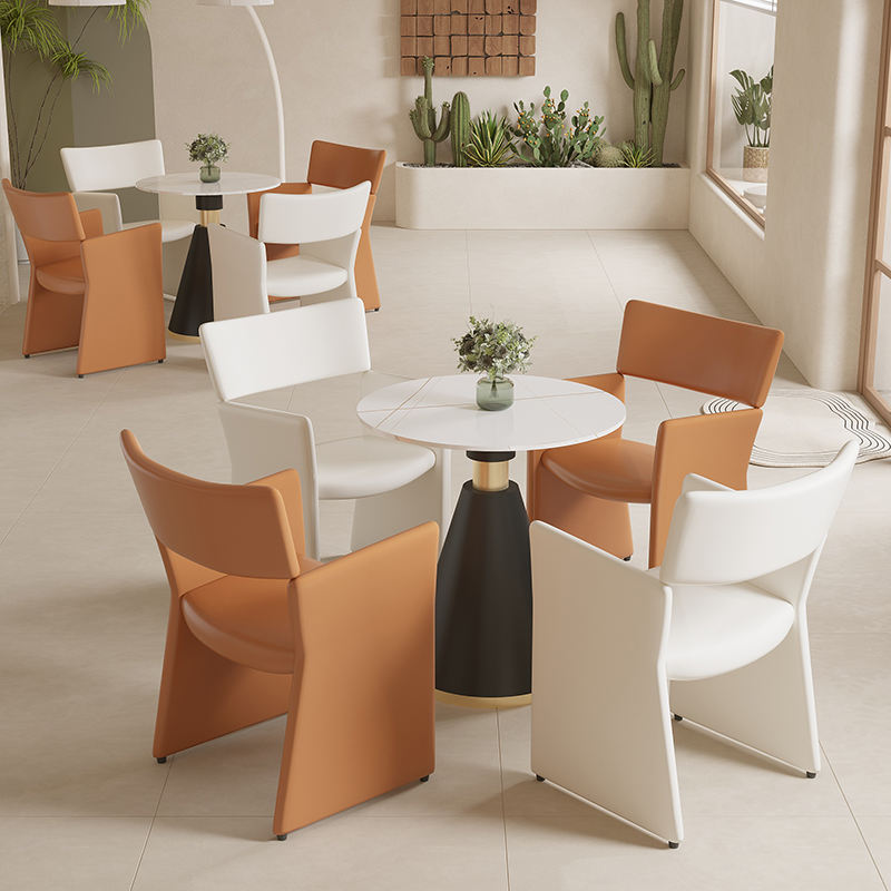 ชุดเก้าอี้รอพร้อมโต๊ะกลมพร้อมเก้าอี้สีส้มและสีเบจสำหรับร้านกาแฟ ร้านเสริมสวย หรือพื้นที่ต้อนรับสำนักงาน ดีไซน์ทนทาน