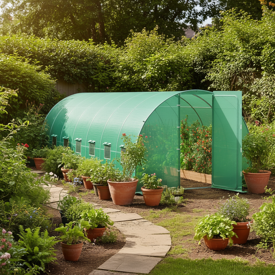 โรงเรือนปลูกพืชแบบเดินเข้าได้ ขนาด 27.38x9.5x7.38 ฟุต โครงเหล็กชุบสังกะสี ผ้าคลุม PE สีเขียว สำหรับใช้งานกลางแจ้ง