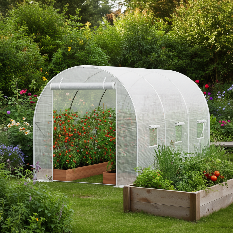 โรงเรือนปลูกพืชแบบเดินเข้าได้ ขนาด 9.58x6.43x6.23 ฟุต โครงเหล็กชุบสังกะสี ผ้าคลุม PE สำหรับใช้ในสวน