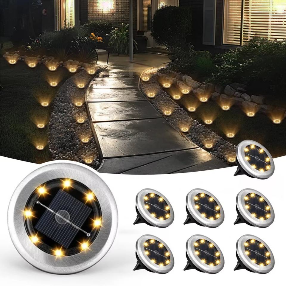 ไฟส่องทางเดินโซลาร์เซลล์แบบแผ่นดิสก์ ไฟส่องสวนกลางแจ้ง ไฟสปอตไลท์กันน้ำขนาดเล็ก 8 LED ไฟสนามหญ้าโซลาร์เซลล์กลางแจ้ง