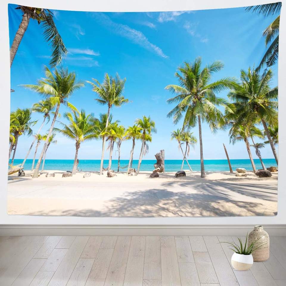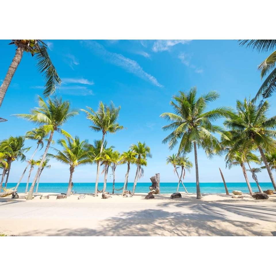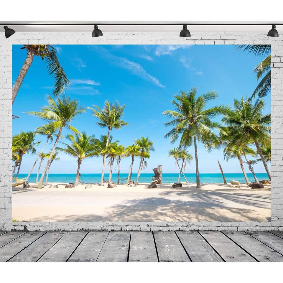 ผ้า7x5ft ตกแต่งผนังพื้นหลังชายหาดฤดูร้อนต้นปาล์มเขตร้อนรูปมะพร้าวทะเลสำหรับวันเกิด Aloha งานแต่งงาน