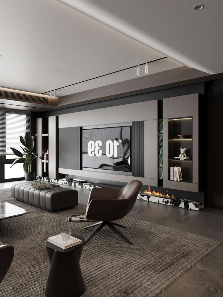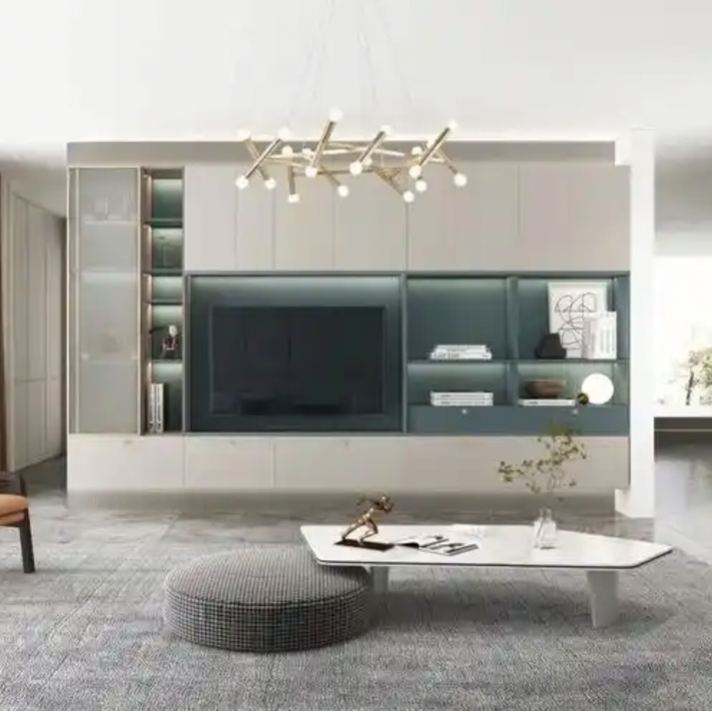 ตู้ทีวีติดผนังทีวีทรงสูงทันสมัยห้องนั่งเล่นทีวีติดผนังแบบบูรณาการ