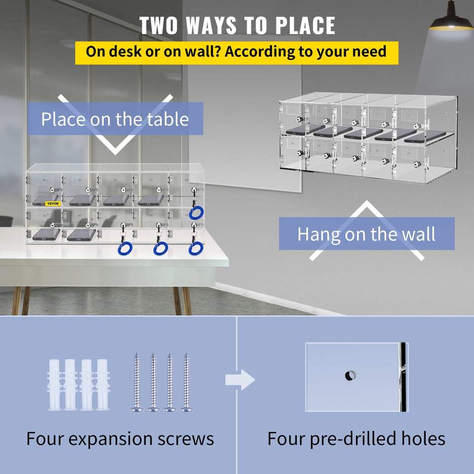 ตู้เก็บโทรศัพท์มือถืออะคริลิคแบบติดผนัง 10 ช่อง พร้อมกุญแจล็อคสำหรับสำนักงาน ห้องเรียน และห้องออกกำลังกาย