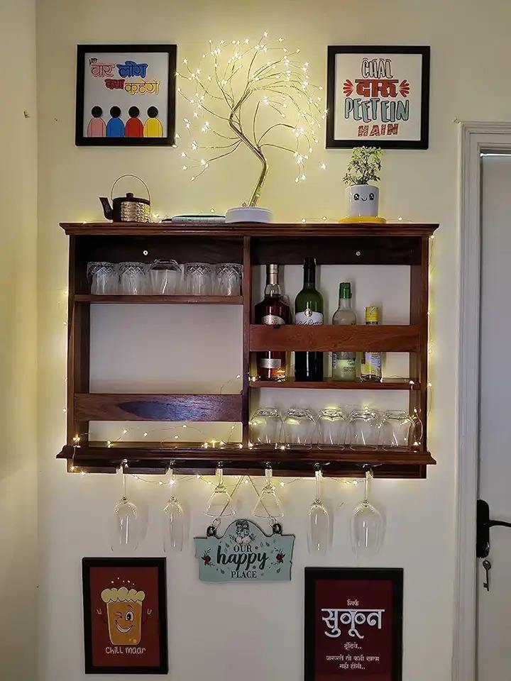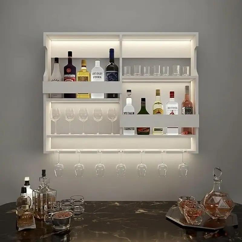 ตู้บาร์ติดผนังพร้อมไฟ LED และชั้นวางแก้ว ชั้นวางเก็บเครื่องดื่มสำหรับบ้านสไตล์โมเดิร์น