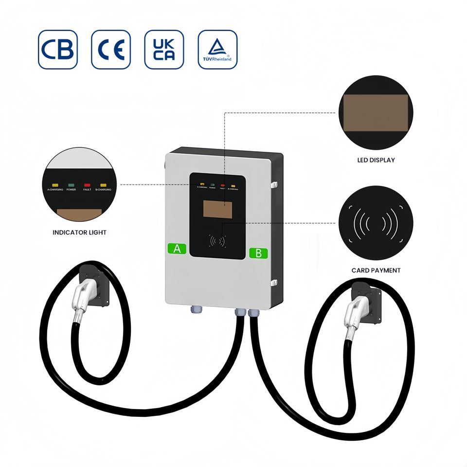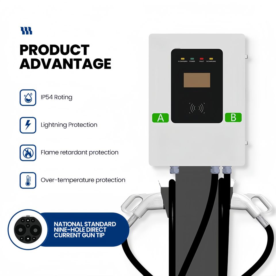 เครื่องชาร์จรถยนต์ไฟฟ้าแบบติดผนัง Wallbox แบบหัวชาร์จคู่ DC กำลังไฟ 40KW/60KW รองรับ CCS1/CCS2 ควบคุมผ่านแอป/RFID แรงดันไฟฟ้าขาเข้า 380V
