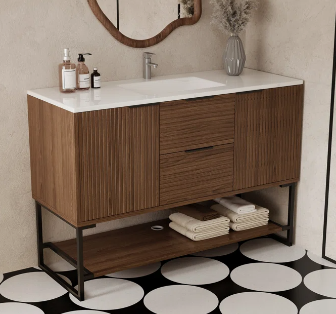 ตู้ห้องน้ำสไตล์โมเดิร์นสีวอลนัทกันน้ำเมลามีน MDF + พีวีซีเฟอร์นิเจอร์กันความชื้นสูง