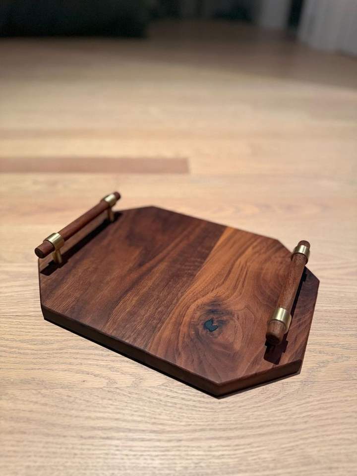 ถาดเสิร์ฟไม้วอลนัทพร้อมหูจับทองเหลือง ดีไซน์หรูหราทันสมัย เหมาะสำหรับเสิร์ฟชีส ของว่าง เครื่องดื่ม วางบนโต๊ะกาแฟ