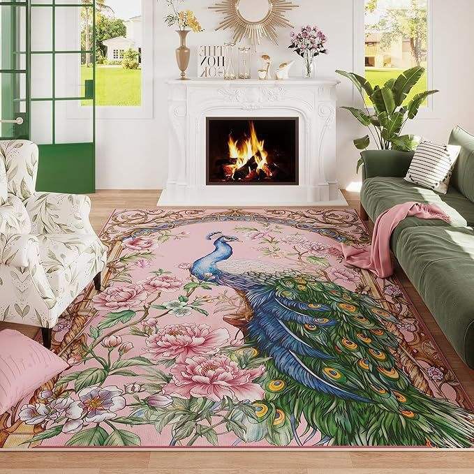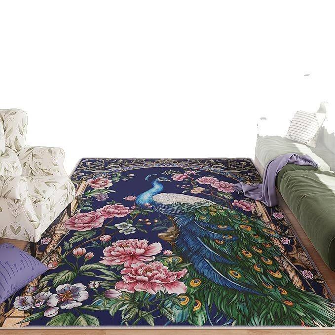 พรมลายพิมพ์นกยูง วาน ซินหลง รูปทรงสี่เหลี่ยมผืนผ้า สไตล์คลาสสิก ป้องกันคราบสกปรก เหมาะสำหรับห้องนั่งเล่นและห้องนอน พรมกำมะหยี่คริสตัล