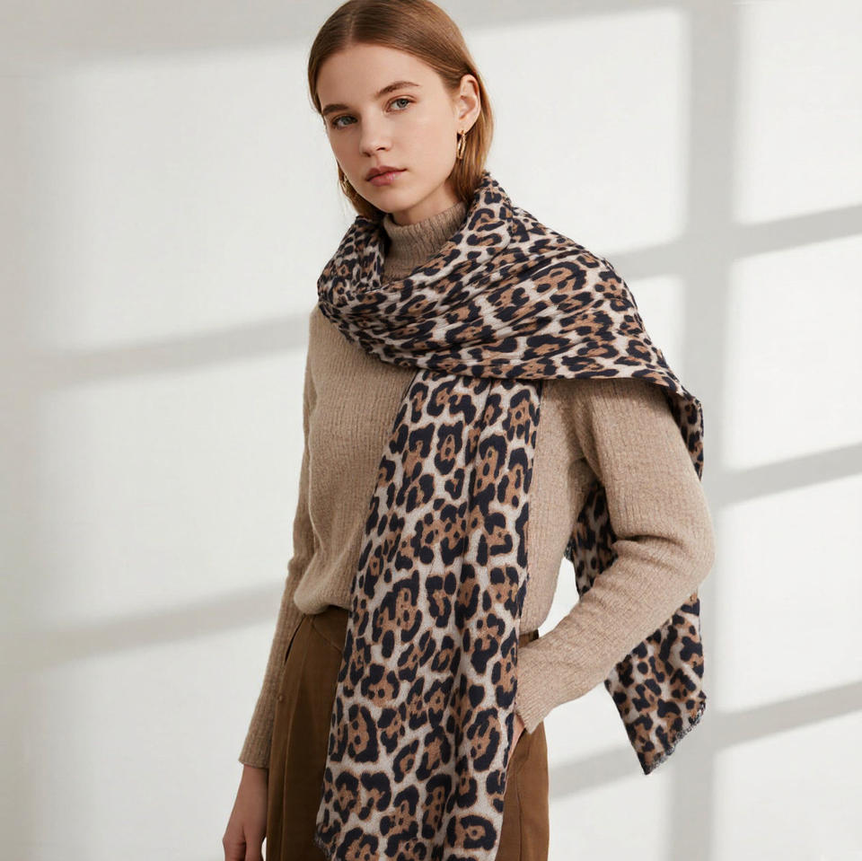 ผ้าพันคอพิมพ์ลายเสือดาวสำหรับผู้หญิง ผ้าขนสัตว์ผสม ขนาด 70x180 ซม. ผ้าคลุมไหล่ฤดูหนาวเนื้อนุ่มสบาย ลายสัตว์ แฟชั่นผ้าพันคอยาวสำหรับฤดูใบไม้ร่วง