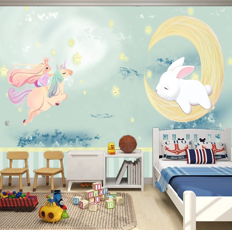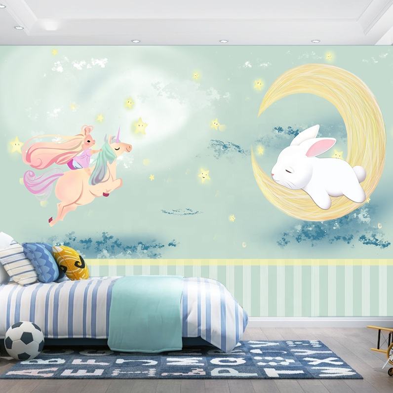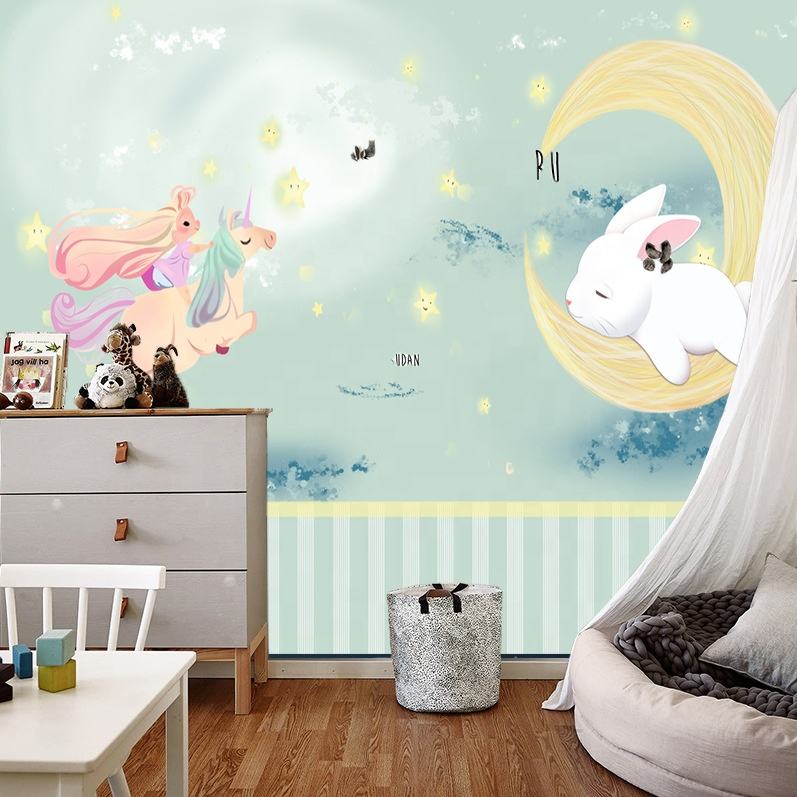 วอลเปเปอร์ผ้าแคนวาสกันน้ำลายกระต่ายยูนิคอร์นพระจันทร์อุ่นๆ สไตล์โมเดิร์นรักษ์โลก สำหรับห้องเด็ก ห้องนั่งเล่น ห้องนอน ติดตั้งง่าย