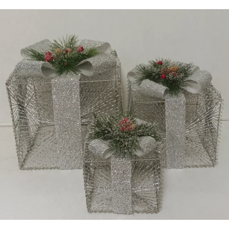 ชุดตกแต่งดิ้นสีขาวอบอุ่นพร้อมกล่องของขวัญไฟ LED 3ดวงสำหรับตกแต่งในบ้านและสนามหญ้า
