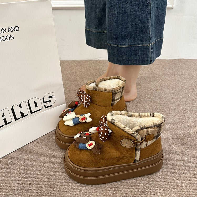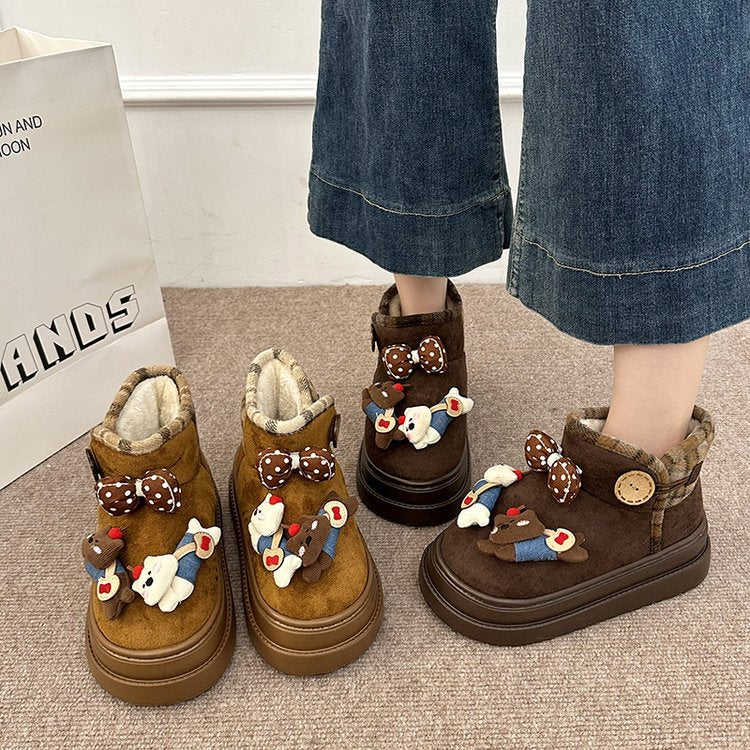 รองเท้าบูทหิมะขนเฟอร์เทียมสำหรับฤดูหนาว บุด้วยหนังแท้ ส้นกลาง (3-5 ซม.) ทรงสั้น พื้นรองเท้าหนังกลับแบบแพลตฟอร์ม พื้นยาง PU