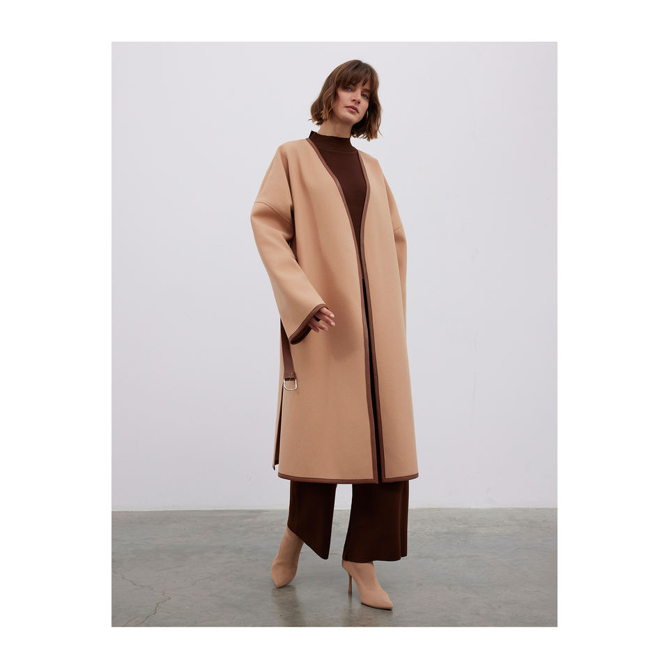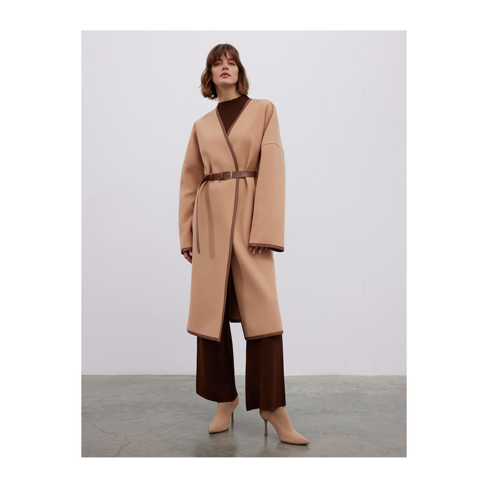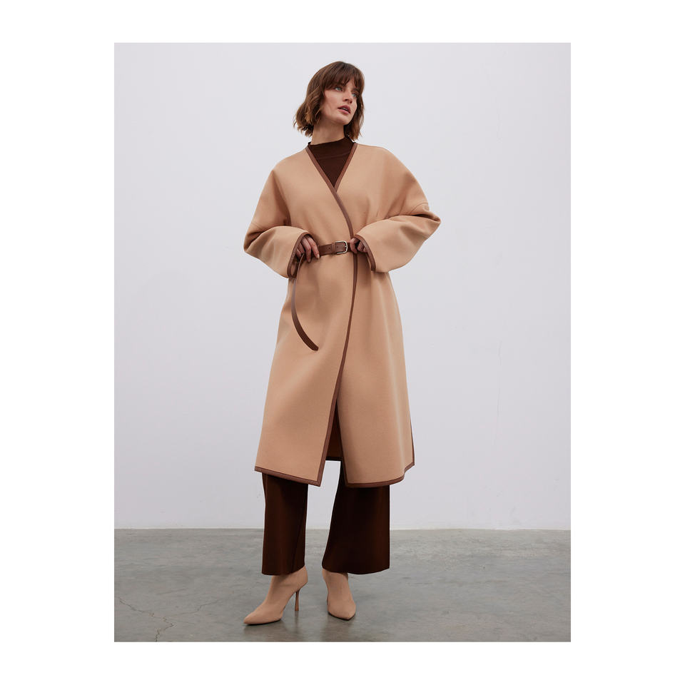 เสื้อโค้ทหนังผสมขนสัตว์อุ่นสบาย พร้อมดีเทลขอบหนังและเข็มขัด