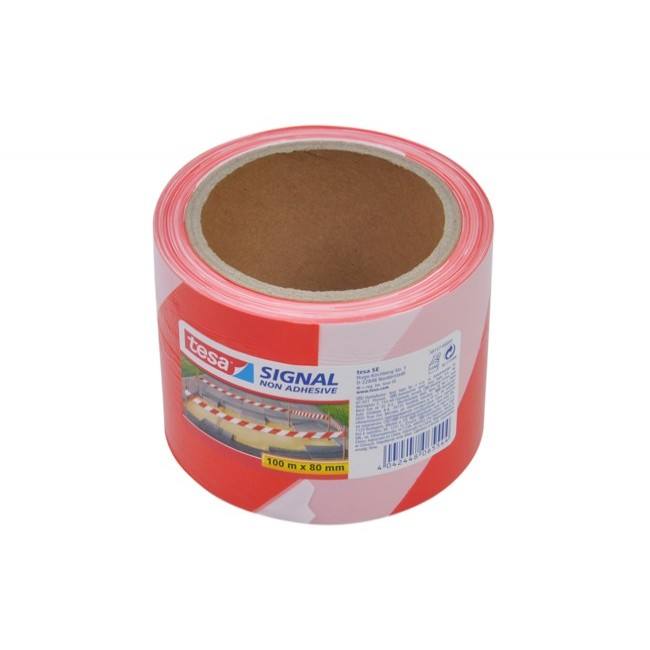 เทปเตือนไม่มีกาวสัญญาณเทสลาสีขาว-แดงความยาว100เมตรกว้าง80มม
