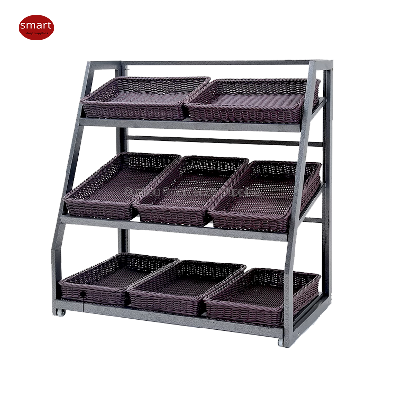 ตะกร้าหวาย PP ล้างทำความสะอาดได้ ชั้นวางผลไม้และผักแบบเรียบง่าย ชั้นวางสินค้าทำจากหวายโลหะ สำหรับร้านขายผลิตภัณฑ์ออร์แกนิก