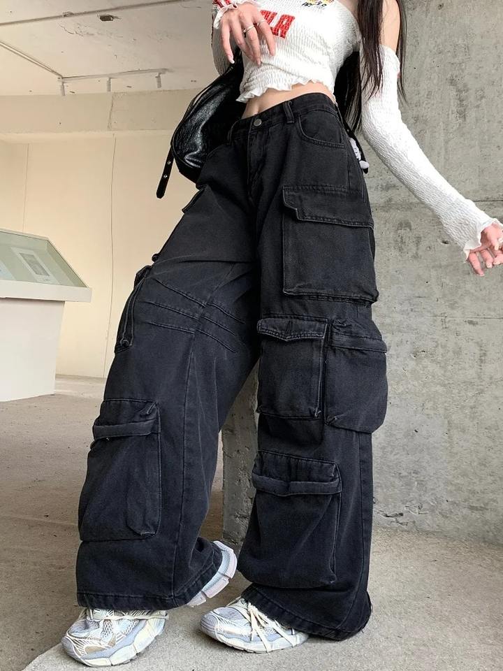 กางเกงยีนส์สีดำทรงหลวมแบบคาร์โก้สำหรับผู้หญิง มีกระเป๋าหลายช่อง ขากว้าง