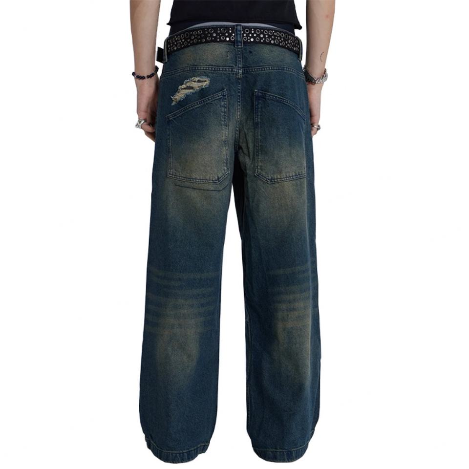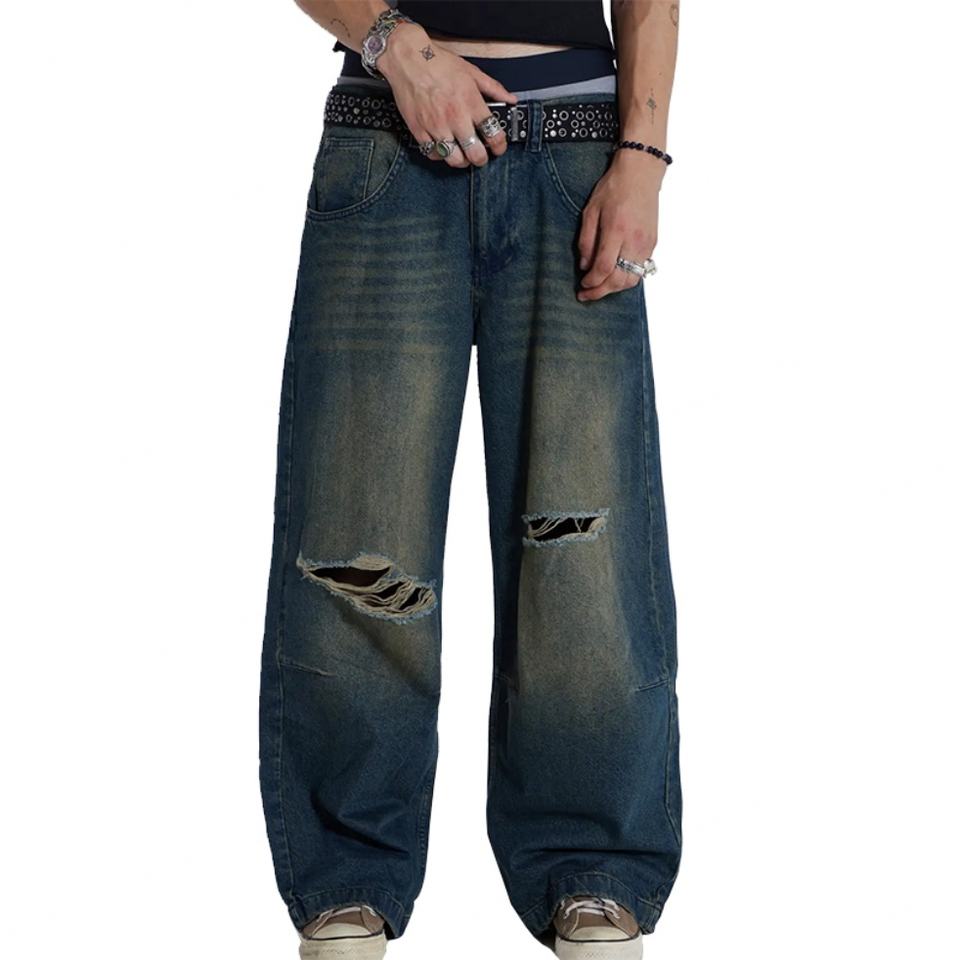กางเกงยีนส์ทรงแบ็กกี้สีน้ำเงินฟอก ขาดเข่า ซิปหน้า ผ้าเดนิมหนา ไม่ยืด สำหรับผู้ชาย