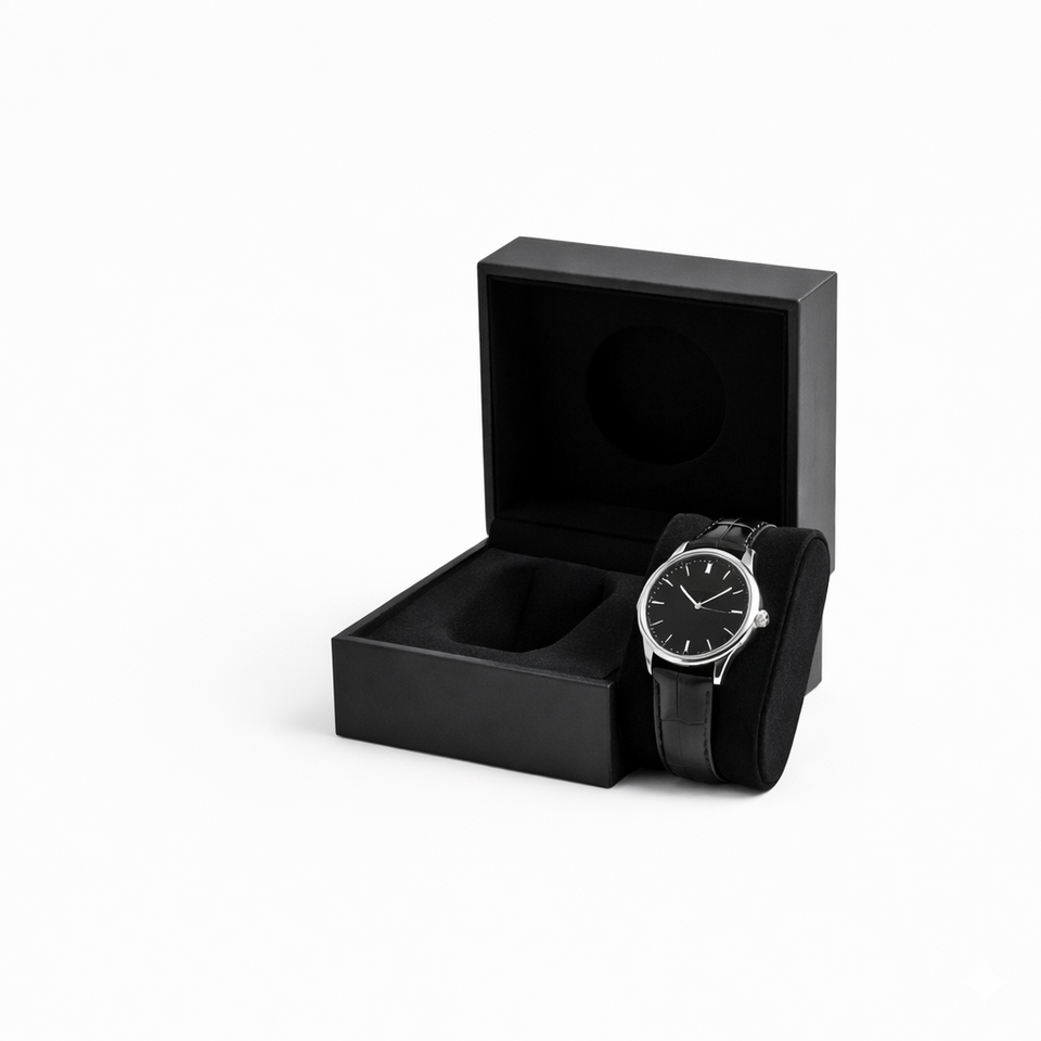 กล่องใส่นาฬิกาสุดหรู กล่องของขวัญแบบพับได้แข็งแรง บุด้วยกำมะหยี่ พร้อมหมอนรองนาฬิกา ปั๊มฟอยล์โลโก้ตามสั่ง ราคาขายส่งจากโรงงาน