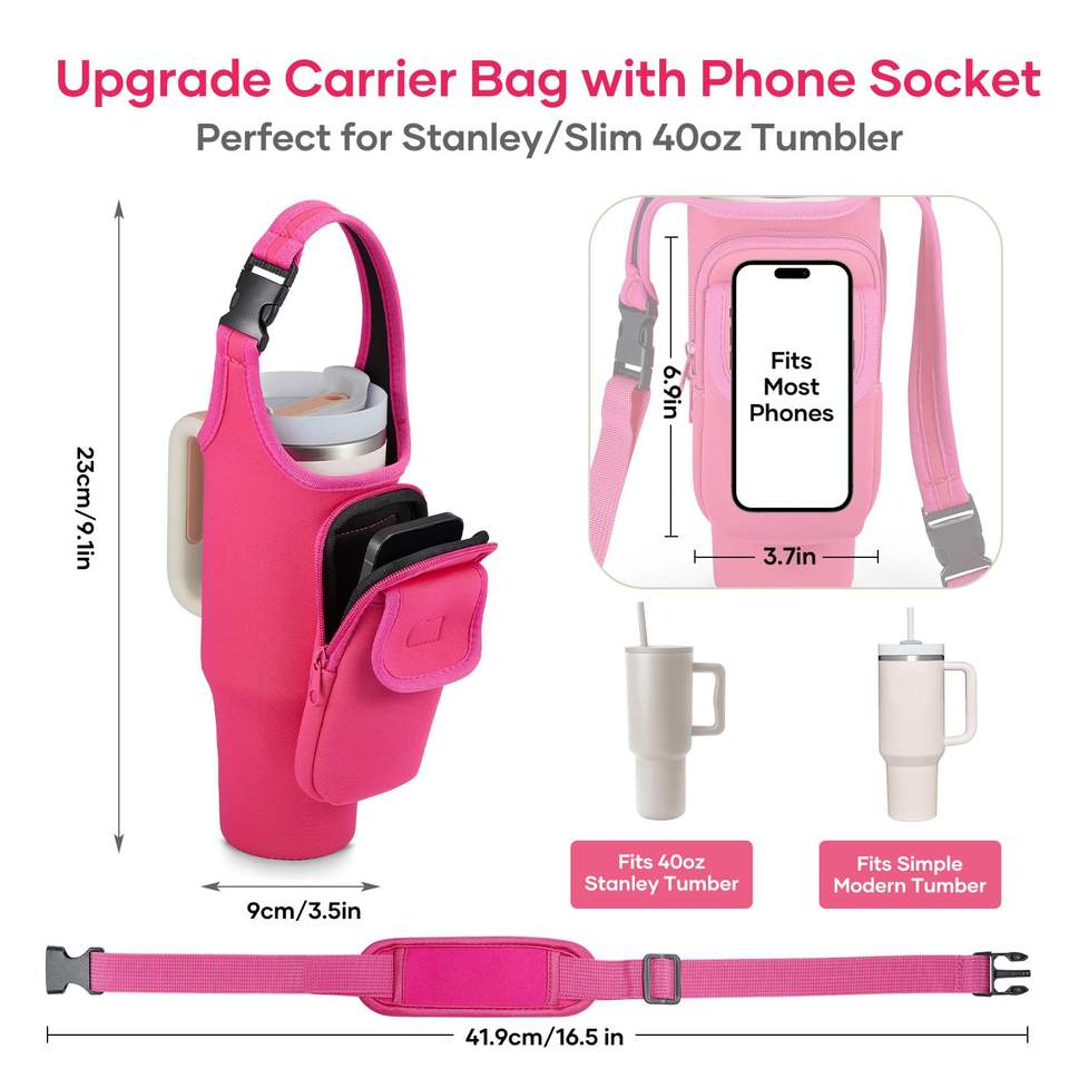 กระเป๋าใส่ขวดน้ำพร้อมช่องใส่โทรศัพท์และช่องเปิดสำหรับแก้วน้ำ Stanley 40/30oz พร้อมที่จับที่วางแก้วนีโอพรีนพร้อมสายคล้องไหล่