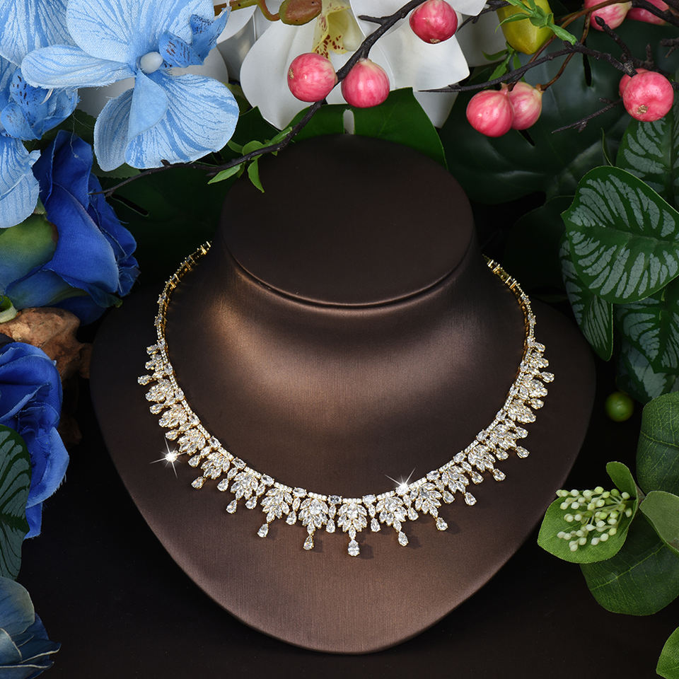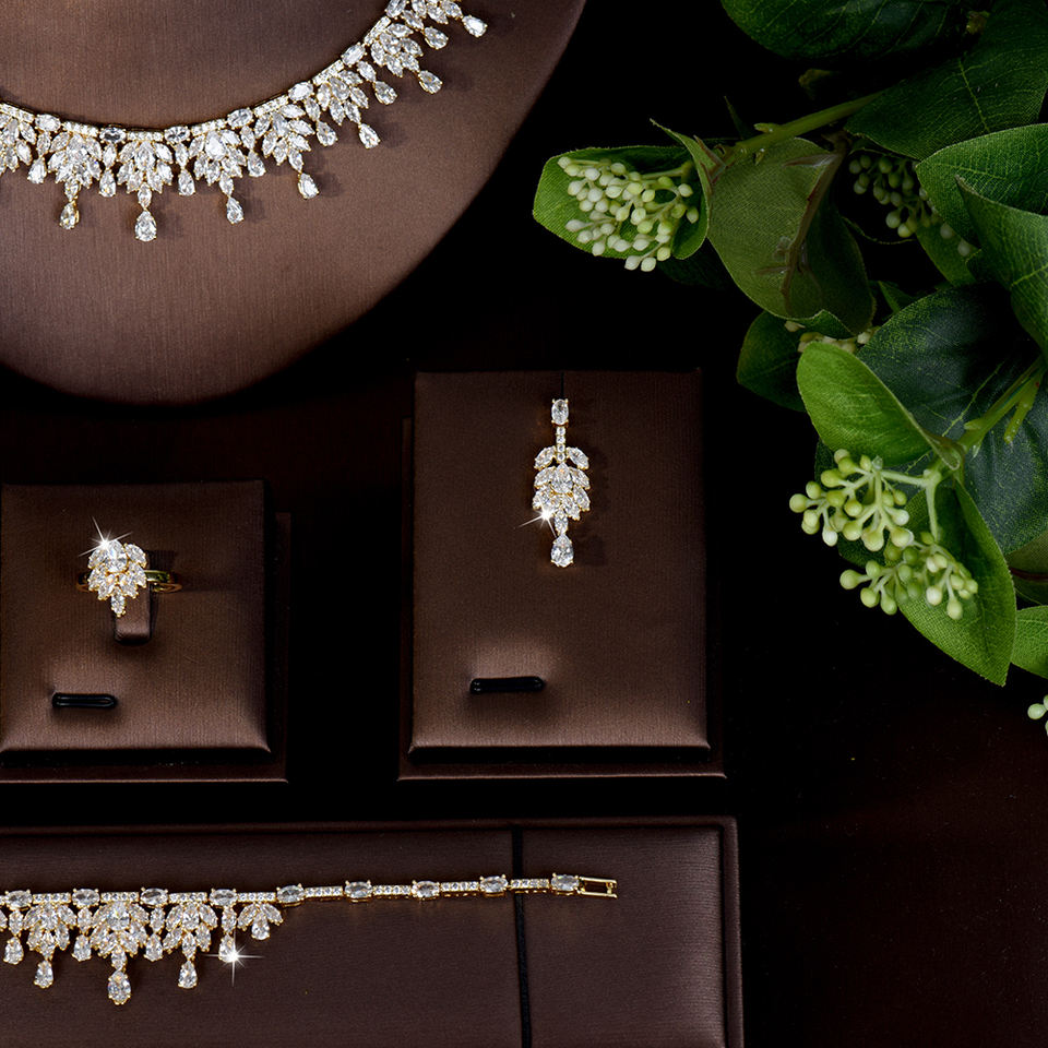 ต่างหูสร้อยคอเซอร์โคเนียทรงหยดน้ำสีทองทรงลูกบาศก์4ชิ้นเครื่องประดับสำหรับเจ้าสาวดูไบไนจีเรียชุดเครื่องประดับสำหรับงานแต่งงานของผู้หญิง S-512