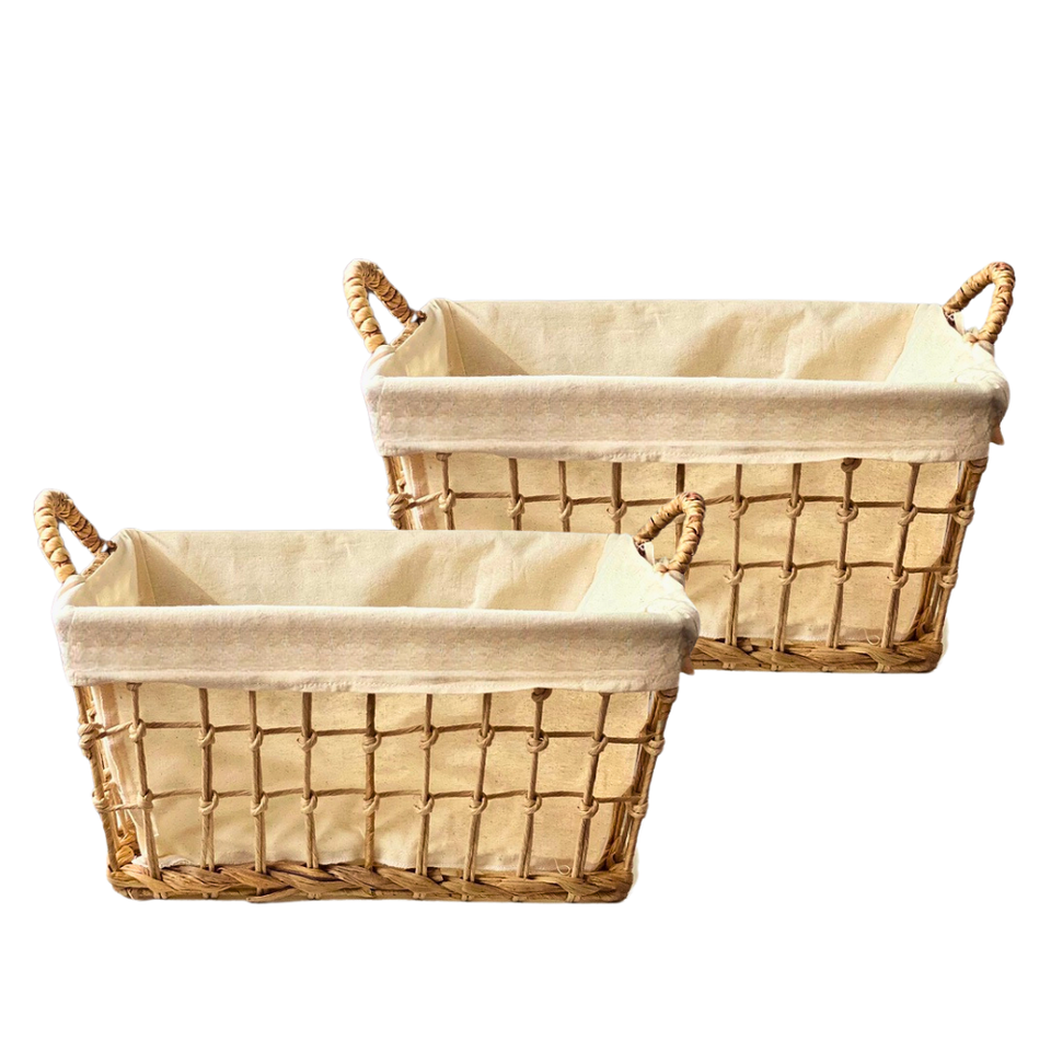 ตะกร้าหวายจากหญ้าทะเลผักตบชวาใส่ของพร้อมแผ่นรองผ้าฝ้ายและกรอบโลหะ