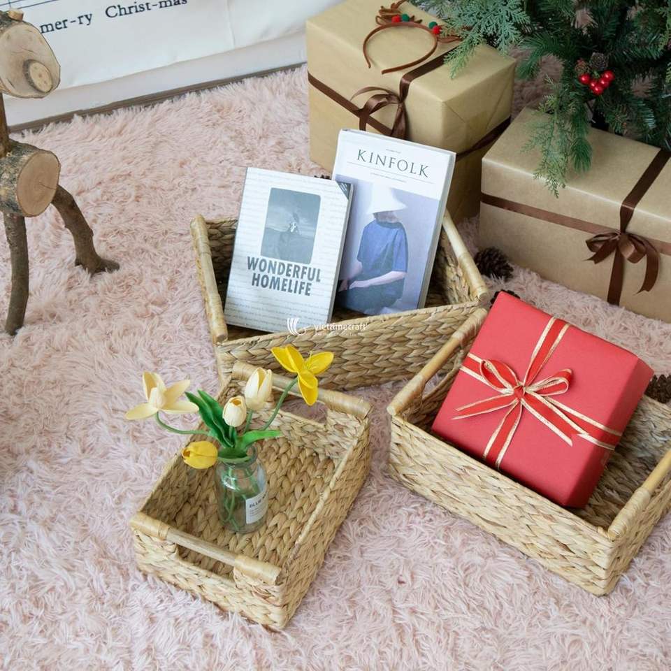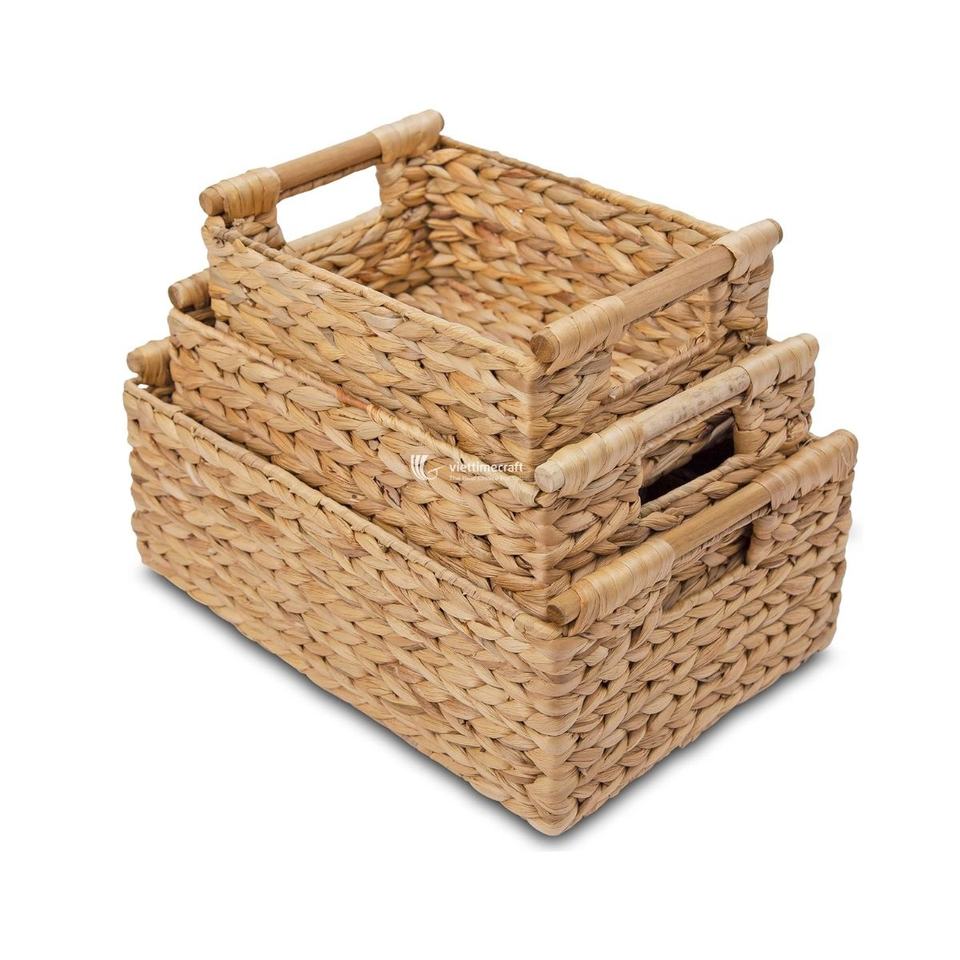 ชุดตะกร้าเก็บของจากผักตบชวา แบบสานรักษ์โลก พร้อมฝาปิดลายหยักและหูจับไม้ ขายส่ง