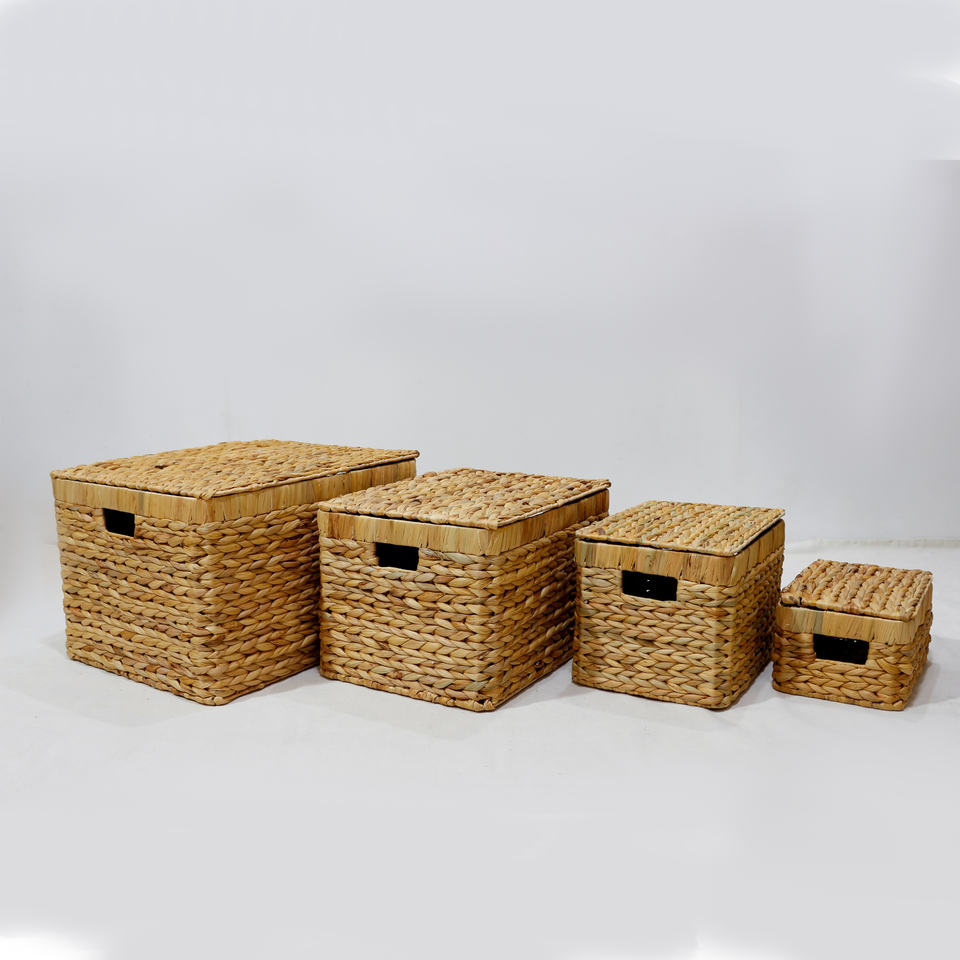 ตะกร้าเก็บของผักตบชวา ชุด 3 ใบ ทรงสี่เหลี่ยมผืนผ้า พร้อมฝาปิดและหูหิ้ว