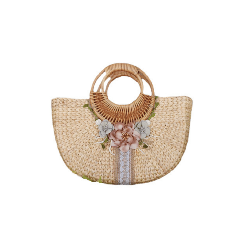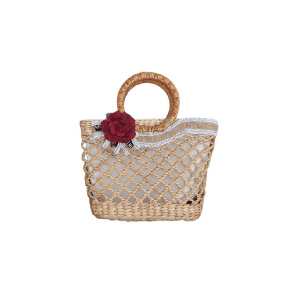 ถุงผักตบชวาก้านแห้งธรรมชาติที่มีมือจับไม้ไผ่และแทรกเชือกสำหรับออกนอกสถานที่ในฤดูร้อนและสวมใส่ในเมืองประเทศเวียดนาม