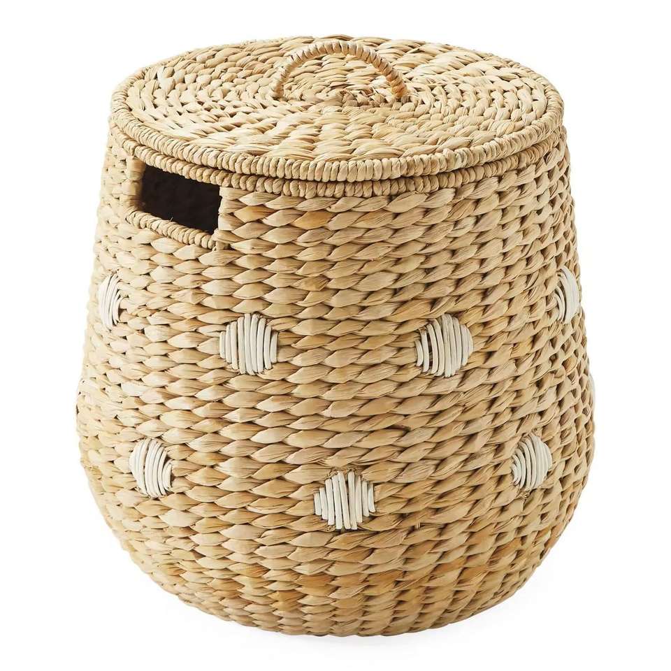 ตะกร้าผักตบชวาลายจุด ตะกร้าเก็บของทำมือ ขายส่ง เป็นมิตรกับสิ่งแวดล้อม ผลิตโดย VgreenArt จากเวียดนาม